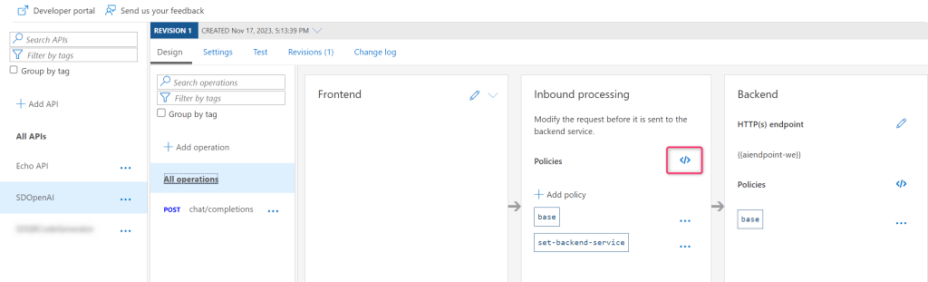 Now we need to pass the previously defined api keys variables in the header of the HTTP request in order to be able to call Azure OpenAI correctly. To do that, we need to go into the Inbound processing section and then click on Policies:
