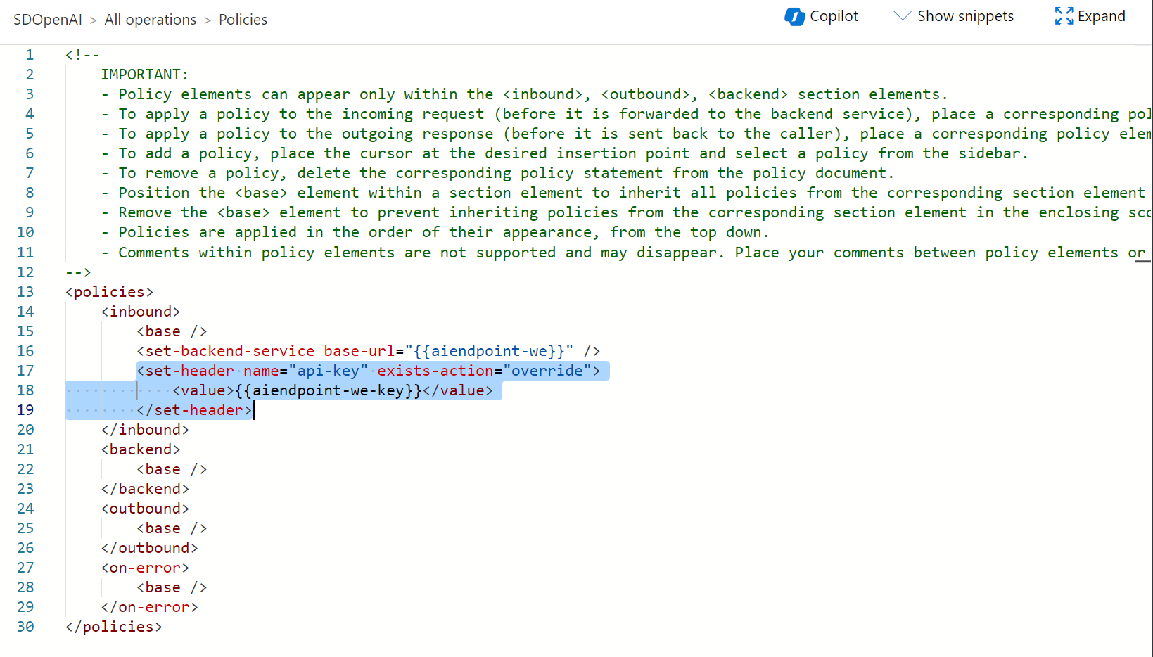 With the above policy, when a request is sent to the Azure API Management endpoint (our unique endpoint for accessin Azure OpenAI) the policy sets the backed service url and inserts the api-key parameter (with its appropriate value) in the request header. Values are taken from the named values parameters previously created.