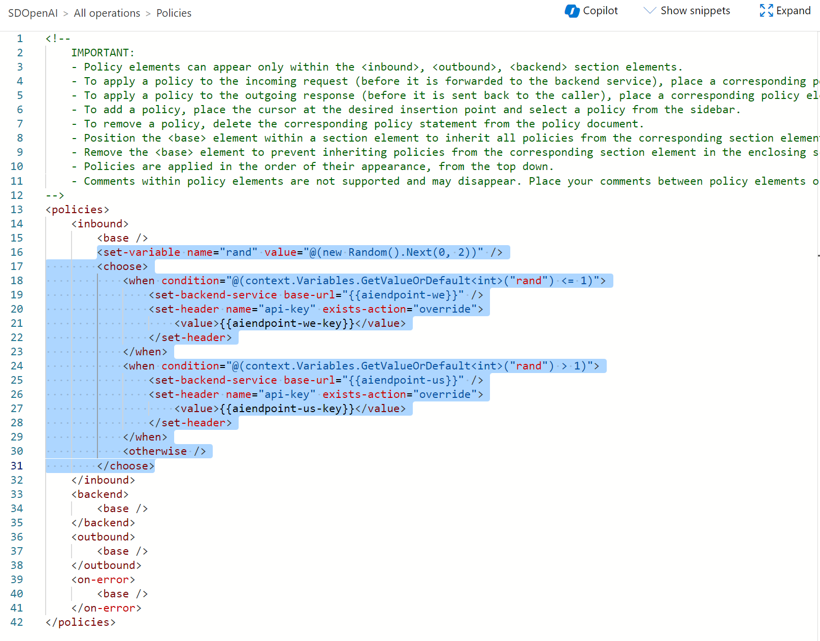 Now we need to handle the load balancing of HTTP requests between the various Azure OpenAI instances. We can do that again by using the Inbound processing policy. Here we can have differen type of logic to route requests between endpoint.