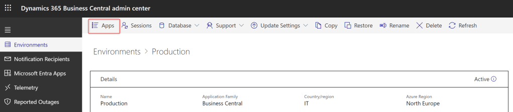 The traditional way to discover if AppSource apps updates are available for a given tenant is to go in Dynamics 365 Business Central Admin Center, select your environment and then select Apps: