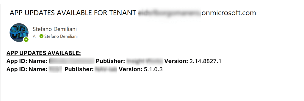 But how can I be notified if an AppSource app is available on my customer’s tenant without going to the Admin Center? When managing tons of Dynamics 365 Business Central SaaS customers, I would like to receive an automatic notification when AppSource apps are available on my customer’s tenant. In the notification I would like to have the list of available updates with the related details for each app to update.