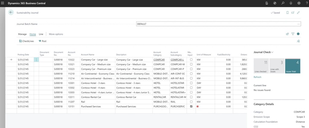 Sustainability Journals can then be used to record sustainability-related activities and metrics within an organization, using the same user experience as other journals in Business Central. Within the journal, users have the option to input emissions manually if they possess the necessary information. Alternatively, if they lack this data, they can utilize built-in formulas to accurately calculate emissions based on specific known parameters corresponding to various types of sources and accounts.