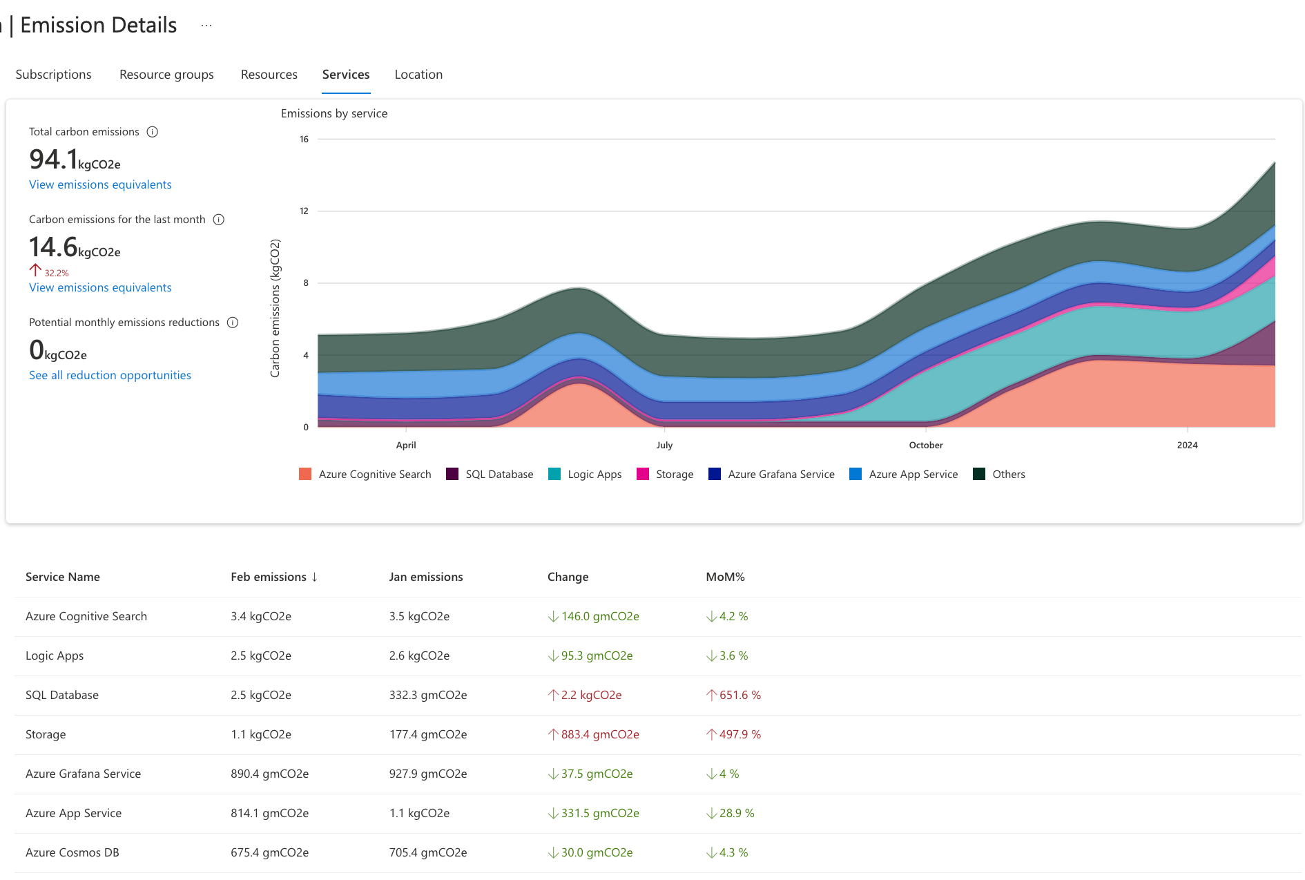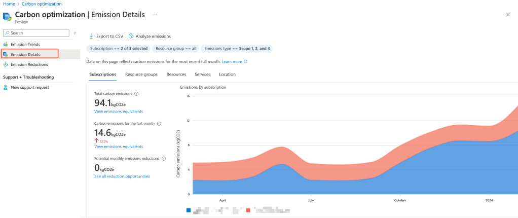The emissions details page shows you a detailed breakdown of your carbon emission with a breakdown by Subscription (default):