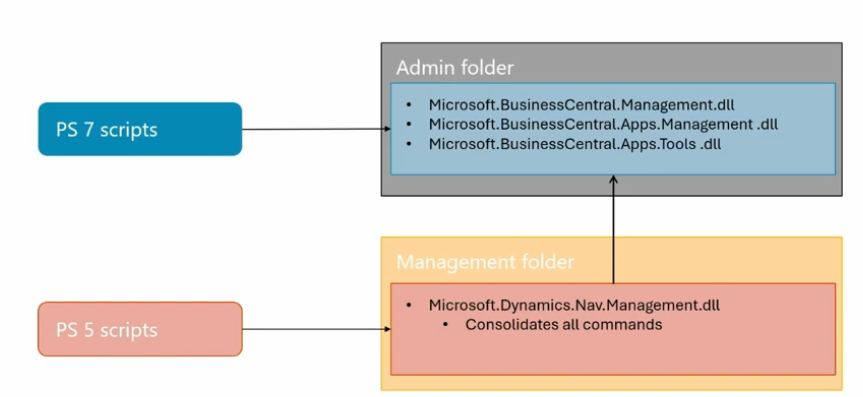 In order to temporary support this change, Microsoft is also providing a backward compatibility bridge with Powershell 5 that, when used, it will load the (now deprecated) Microsoft.Dynamics.Nav.Management.dll files, that in turns will load the new tool.