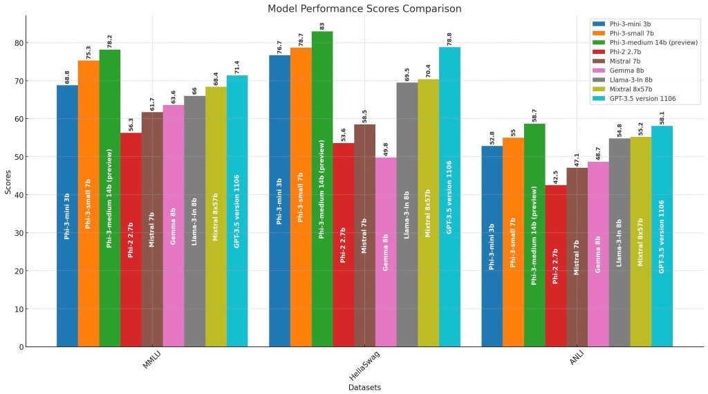 Phi-3-Mini is performing as well as some of the models that are 100 times its size, as you can see also from the following tests (not coming from Microsoft) that show how these models perform with some common AI datasets: