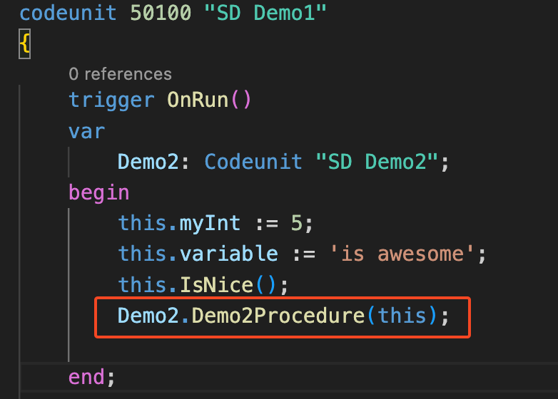And when calling this Demo2Procedure method I can pass this as value (current instance of the Demo1 codeunit):