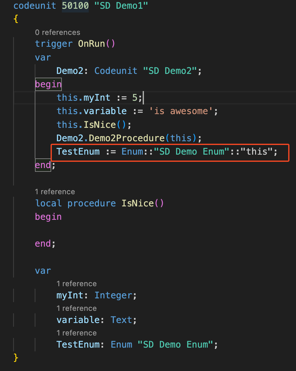 And when calling this Demo2Procedure method I can pass this as value (current instance of the Demo1 codeunit):