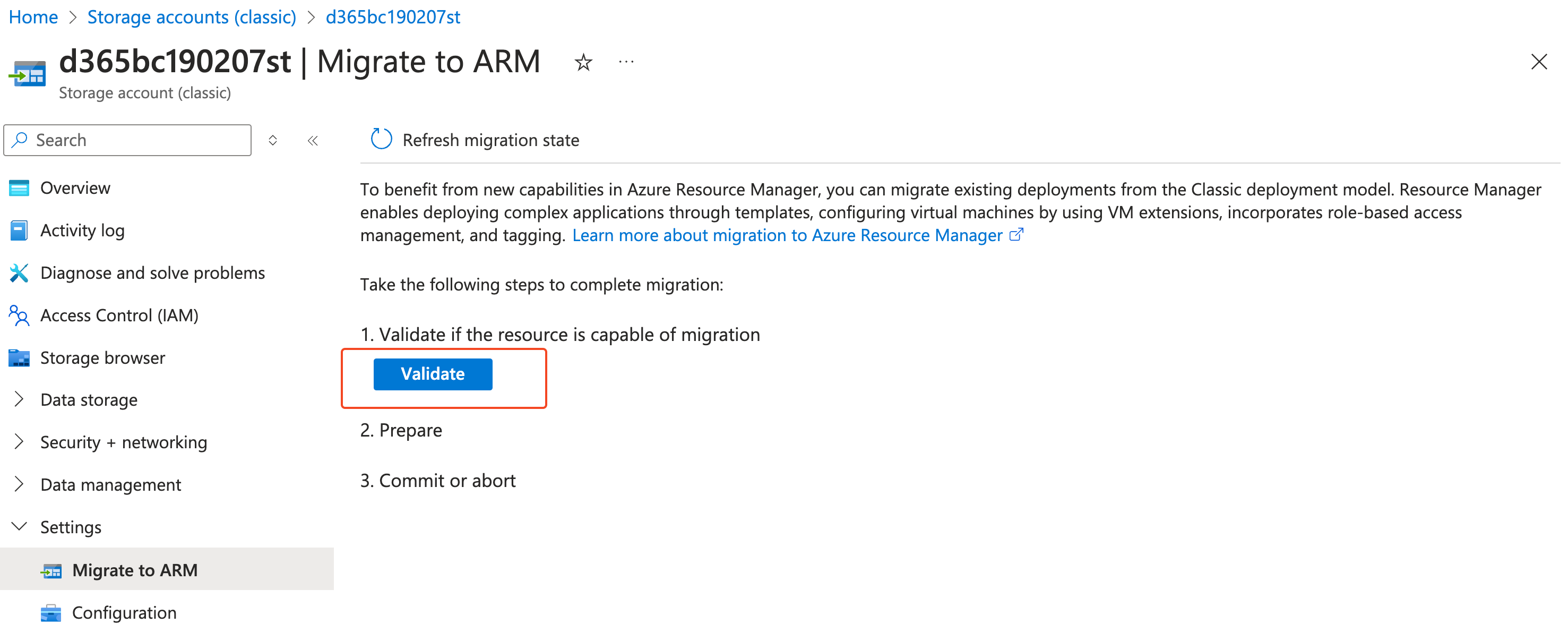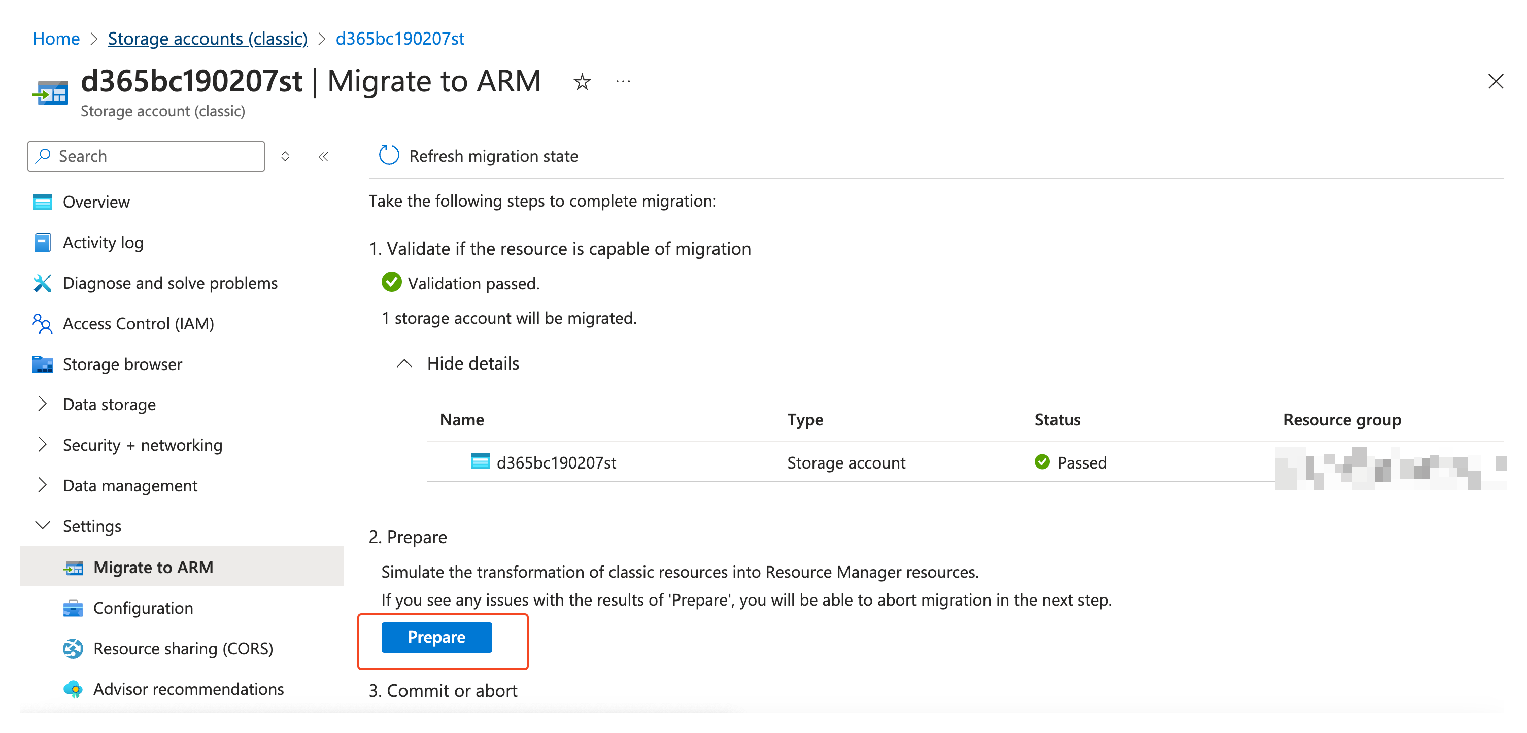When the validation is passed, click on Prepare to create a migrated storage account (the Prepare button will be enabled after some seconds before the validation):
