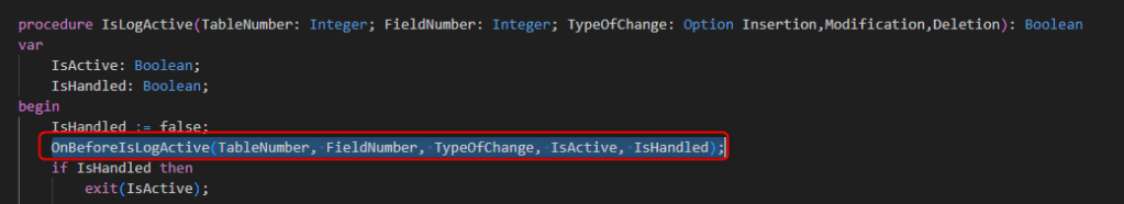 - procedure IsLogActive(TableNumber: Integer; FieldNumber: Integer; TypeOfChange: Option Insertion,Modification,Deletion): Boolean