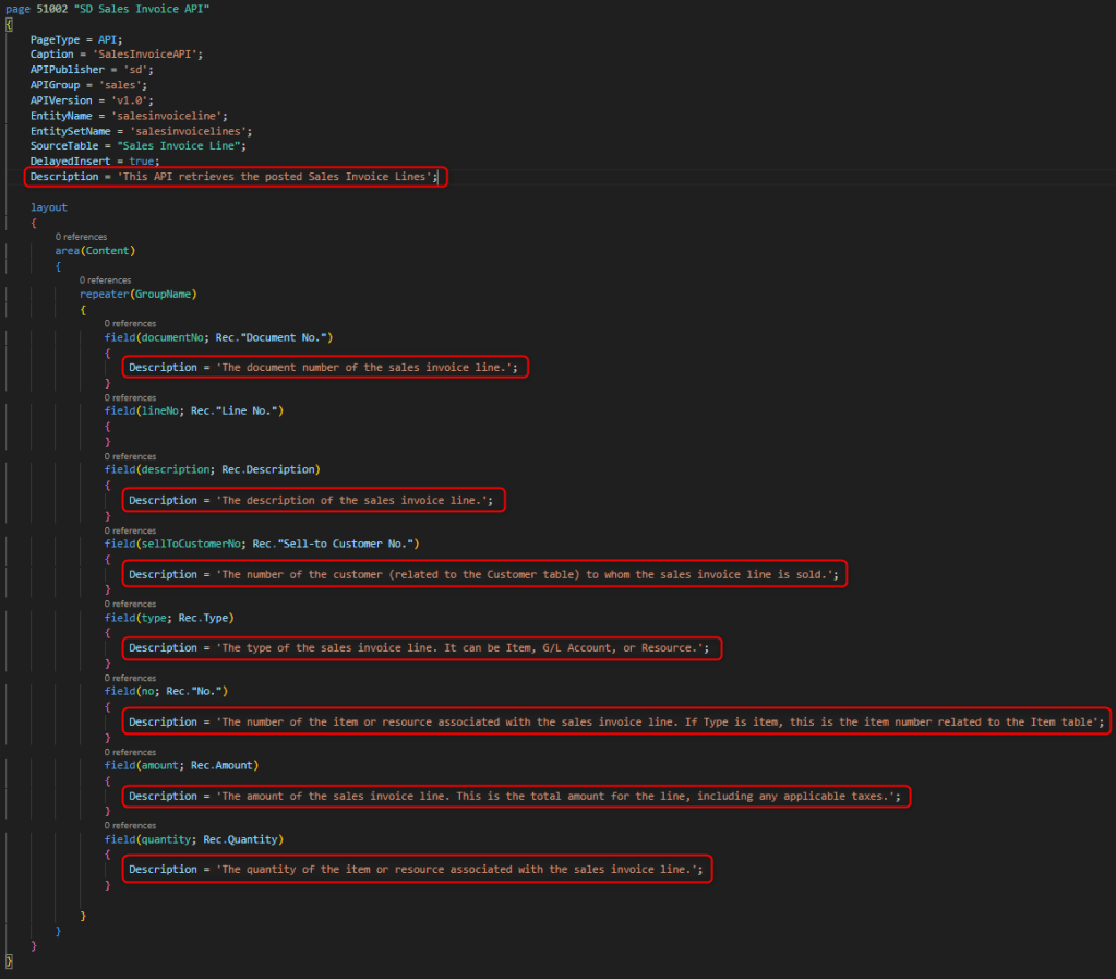 To have a perfect AI-ready API, we should also specify metadata for AI, like for example an explanation about the API endpoint and the API fields. Pages, tables and fields in AL have a property called Description that permits you to set a description for internal use (developer, compiler etc.) and it does not appear to end-users.