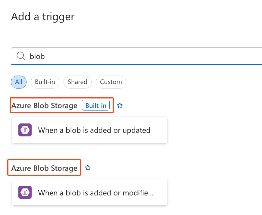 When creating such workflow with the Azure Blob Storage Connector as trigger, you can choose between the built-in and the managed connector versions: