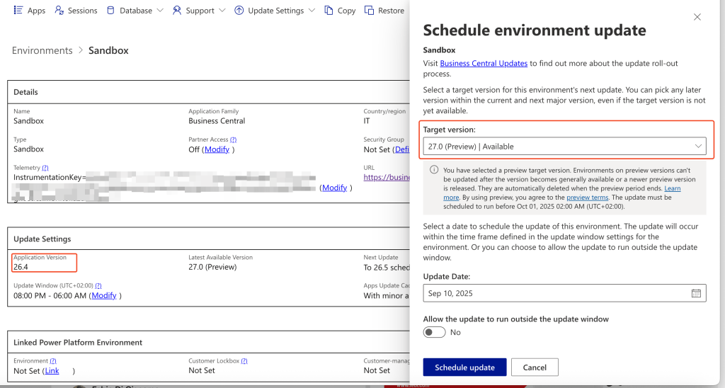 Sandbox environments that have been updated to a preview version are subject to the same policies as environments directly created from scratch on a preview version: