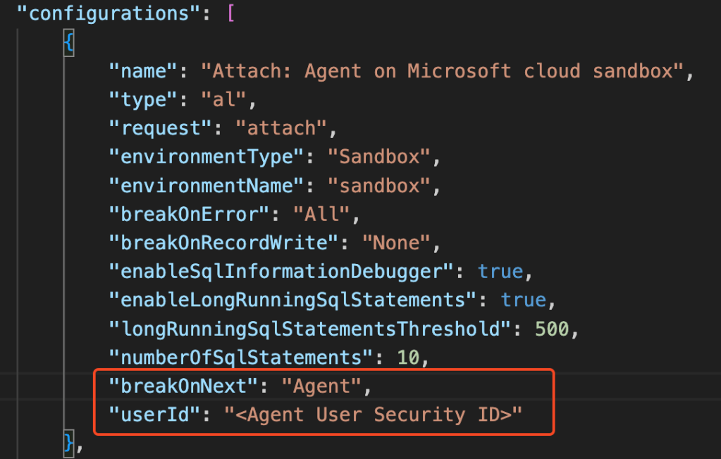 To debug an agent session in a cloud sandbox, you can use the following configuration (passing the security ID of your agent configuration):