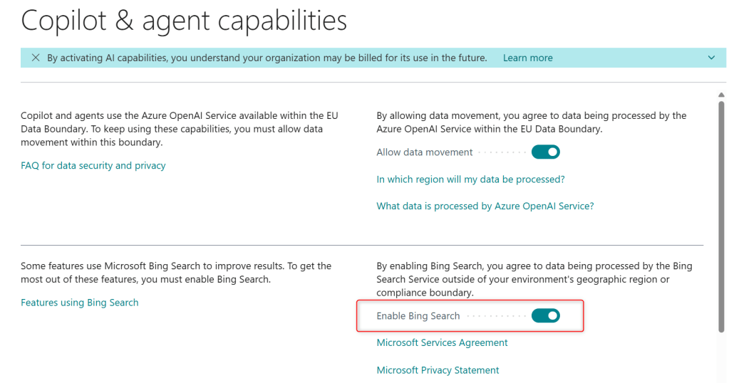 The Copilot Chat can be controlled (so enabled or disabled) from the Copilot & agent capabilities page, so you’re always in control. In this page, if you opt-out of Bing Search (switch it to OFF), you can still use Copilot Chat (but without context indexing).