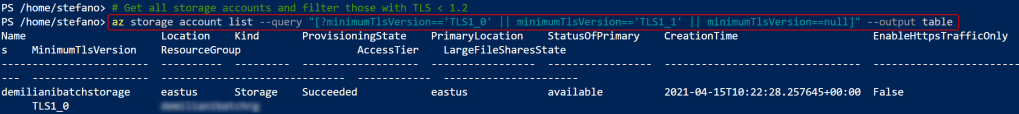 You can easily retrieve all the storage accounts configured with a TLS version < 1.2 by using Azure CLI and executing the following query: