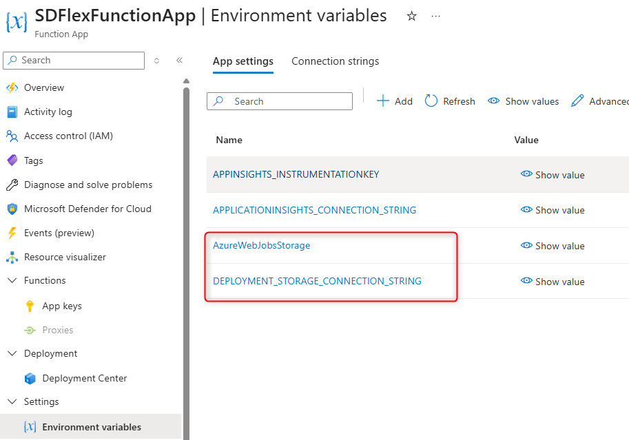 AzureWebJobsStorage(usually the primary storage account).- DEPLOYMENT_STORAGE_CONNECTION_STRING: defines the blob container for code packages in Flex Consumption.
