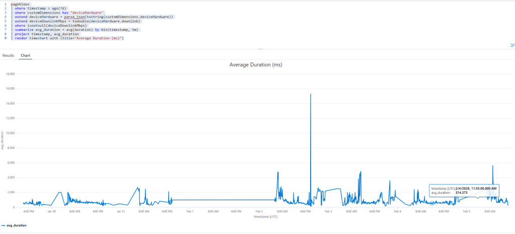 | render timechart with (title="Average Duration (ms)")