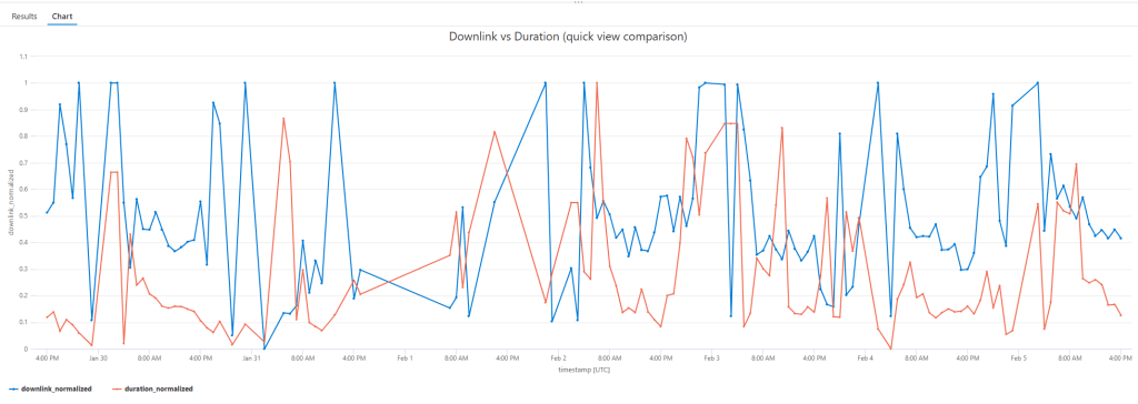 Here I’ve created a KQL query to compare both in the same timeline (normalized), just with the goal to visually check for possible anomalies: