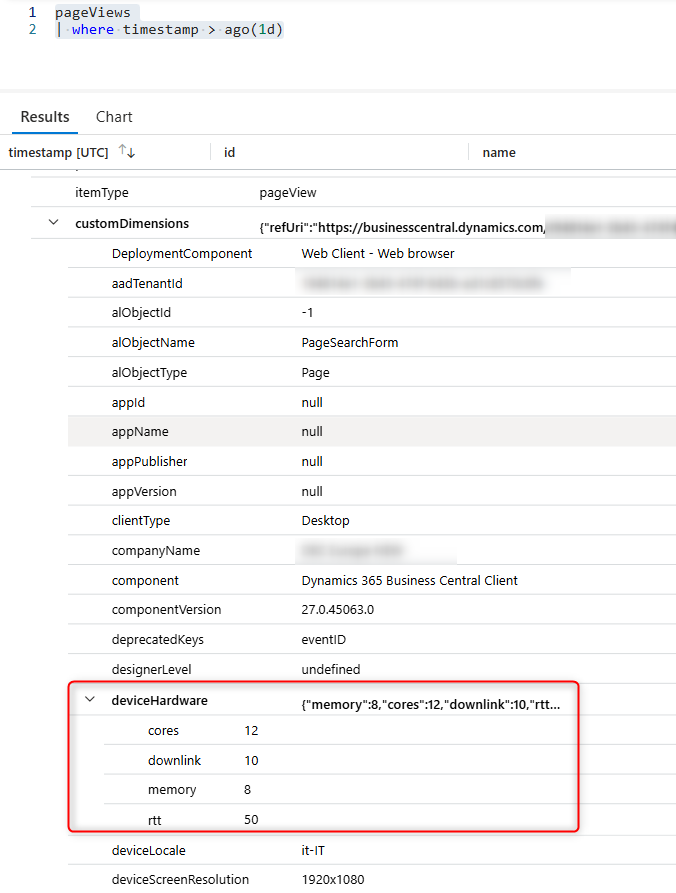 An interesting parameter recently added on page views telemetry is the customDimensions.deviceHardware node: