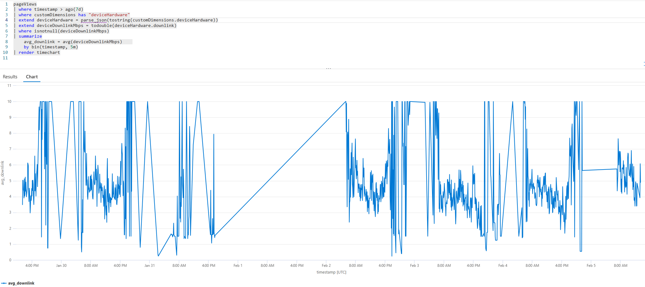 | extend deviceDownlinkMbps = todouble(deviceHardware.downlink)