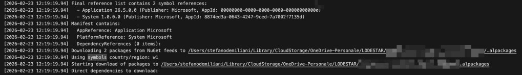 This new command (availbale from the VS Code Command Palette) allows downloading app packages directly from Microsoft’s public NuGet feeds. Symbols are autyomatically downloaded from the Microsoft NuGet feed accordingly to the version you’ve specified in your app.json file (in the “application” tag).